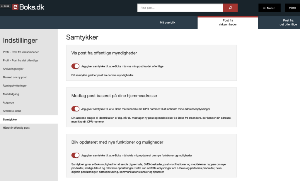 For at vi kan sende til e-boks på en specefik adresse kræver det at du har givet samtykke til det,